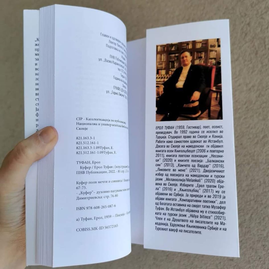 Книгата „Куфер“ на Ерол Туфан излезе од печат и е во издание на издавачката куќа ПНВ Публикации, 2022 година. Ерол Туфан (1959, Гостивар), поет, есеист, преведувач. Во 1992 година се иселил во Турција. Студирал право во Скопје и Конија. Работи како самостоен адвокат во Истанбул. Досега во Скопје на македонски ги објавил: книгата есеи „Книгољубецот“ (2006 и повторно во 2011), книгата поетски есеизации „Несоници“ (2020) и книгите поезија: „Балкански син“ (2013), „Камчето од Вардар“ (2016), „Ликовите во мене“ (2021). Двојазичниот избор од поезијата на македонски и турски јазик „Меланхолија/Melankoli“ (2020) објавена во Скопје. Изборите „Еролтрагом Ерола“ (2016) и „Књигољубац“ (2017) му се објавени во Србија. Во 2019 ја приредил и објавил книгата „Компаративни поетики“, дел од богатата оставина на својот татко Музафер Туфан.